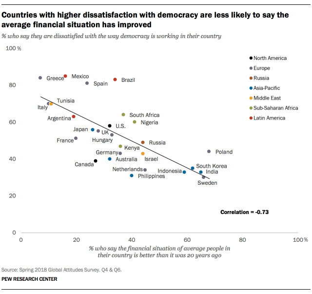 Une enquête menée par le Pew Research Center auprès de 30 133 personnes dans 27 pays du 14 mai au 12 août 2018 a démontré que bien que les idées de la démocratie libérale restent populaires dans le monde, l’engagement envers la démocratie reste faible. Un constat d’échec envers le fonctionnement de la démocratie.
