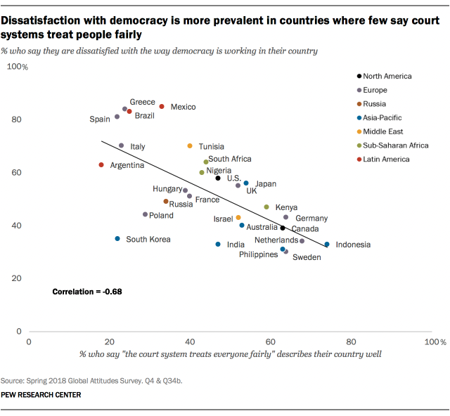La perception que le système judiciaire du pays traite tout le monde équitablement joue un rôle dans la façon dont la démocratie fonctionne dans leur pays.