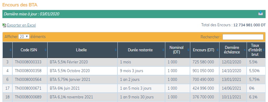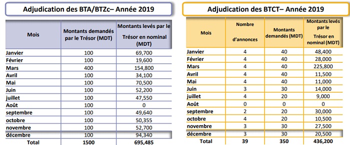 L’année écoulée, l’intervention de l’Etat sur le marché des BTA/BTC était plus faible que prévue. Pour les BTA, le Trésor a demandé 1,5 milliard de dinars mais il n’a levé que 695 millions. Pour les BTC, il a collecté 436 millions. En tout, il a donc levé 1,131 milliard de dinars pour des prévisions de 2,350 milliards.