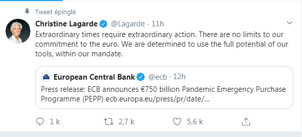 Alors, suite à cette décision prise lors du Conseil des gouverneurs, la présidente de la BCE, Christine Lagarde publiait un tweet. « Les temps extraordinaires nécessitent une action extraordinaire », annonce-t-elle.
