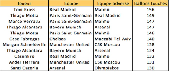 Les joueurs identifiés comme ayant un très gros volume de jeu, ou bien une participation importante dans l’animation du jeu de leurs équipes, ont globalement un comptage de balles touchées, lors d’un match de 90 minutes, qui pourrait varier entre 110 et 160 fois (c’est une fourchette large). Ce sont souvent des joueurs de milieu de terrain, aussi bien en phase de récupération défensive qu’en phase de relance vers l’attaque.