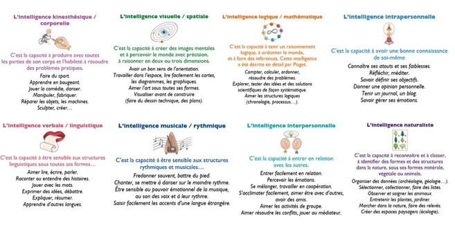 La théorie des intelligences multiples de Howard Gardner a démontré que nos formes d’intelligence sont multiformes. Elles sont au nombre de huit. Nous en développons plusieurs, en lien avec notre cadre de vie, notre éducation, nos parcours, nos expériences personnelles et nos apprentissages. Ainsi, pour chacun, des formes d’intelligence s’affirmeraient et d’autres s’affaibliraient, quand moins sollicitées.