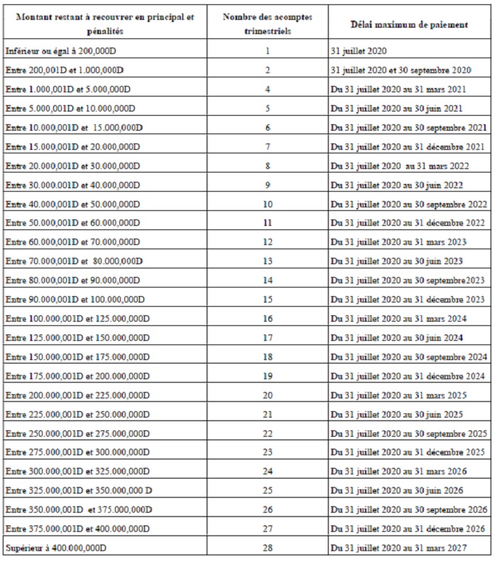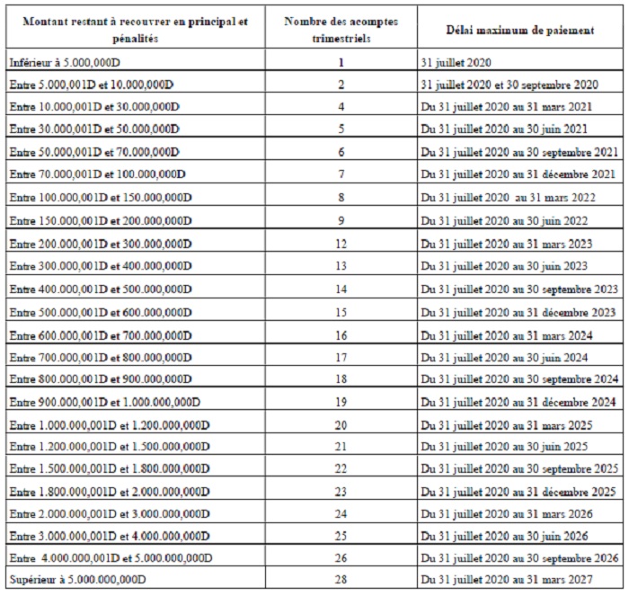 En effet, l’Article premier de l’Arrêté du ministre des Finances du 12 juin fixe le calendrier de paiement des créances fiscales revenant à l’Etat, constatées dans les écritures des comptables publics durant les années 2019 et 2020, dues sur les entreprises affectées par les répercussions de la propagation du Coronavirus « Covid-19 ». Et ce au sens du décret gouvernemental n° 2020-308 du 8 mai 2020 et n’ayant pas fait objet de calendriers de paiement.