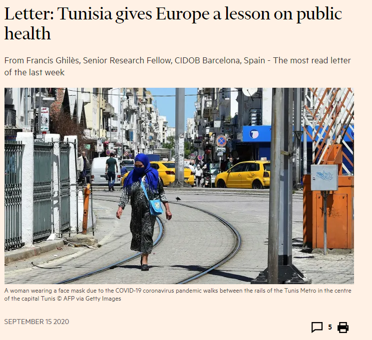 La Lettre: « La Tunisie donne à l’Europe une leçon sur la santé publique » de l’analyste Francis Ghilès, Senior Research Fellow au CIDOB Barcelone.