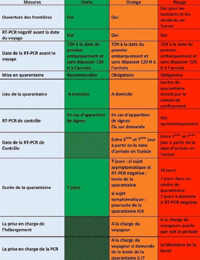 Notons que l’Algérie, la Lybie, la France, le Luxembourg, Malte et l’Italie sont régis par des mesures spécifiques dans le cadre du protocole sanitaire de l’Etat tunisien.