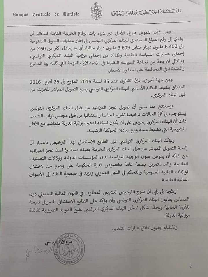 La BCT a, dans cette lettre signée par le gouverneur de la BCT, soulevé la nécessité d’amender la loi en vigueur. Et ce afin de permettre à la Banque centrale de financer ce déficit.