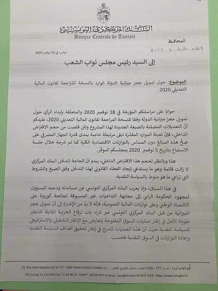 La Banque centrale de Tunisie (BCT) a adressé, en date du 20 novembre 2020, à l’Assemblée des représentants du Peuple (ARP) une lettre relative au financement du déficit budgétaire (une sorte de Budget Quantitative Easing). Financement prévu par la version amendée de la loi de finances complémentaire pour l’année 2020.