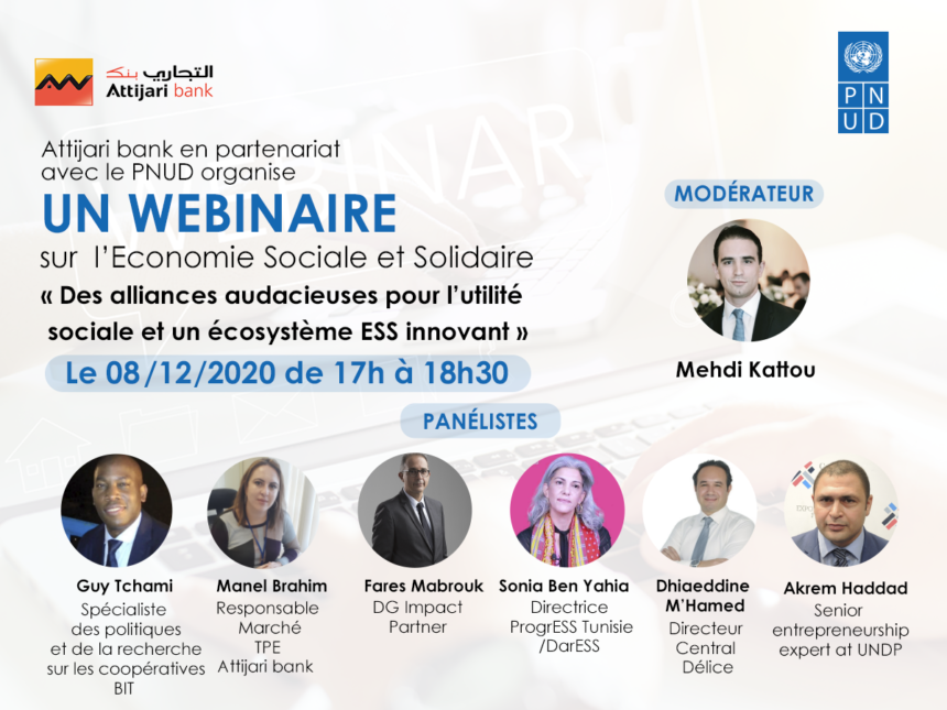 Attijari bank en partenariat avec le PNUD Tunisie organise un webinaire sur l’Economie Sociale et Solidaire (ESS) sous le thème : « Des alliances audacieuses pour l’utilité sociale et un écosystème ESS innovant » qui se tiendra ce mardi 08 Décembre 2020 de 17h00 à 18h30.