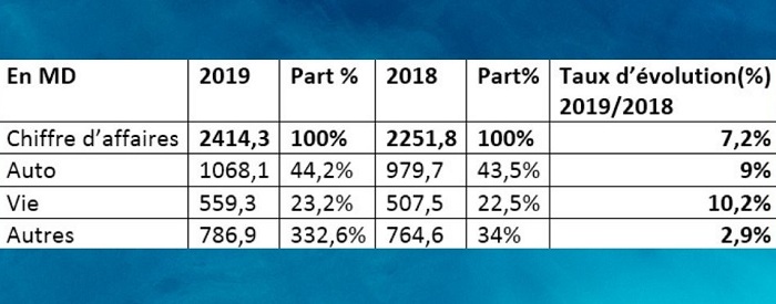 En 2019, les primes émises du marché de l’assurance se sont établis à 2414 millions de dinars, soit une croissance de 7,2% par rapport à 2018.