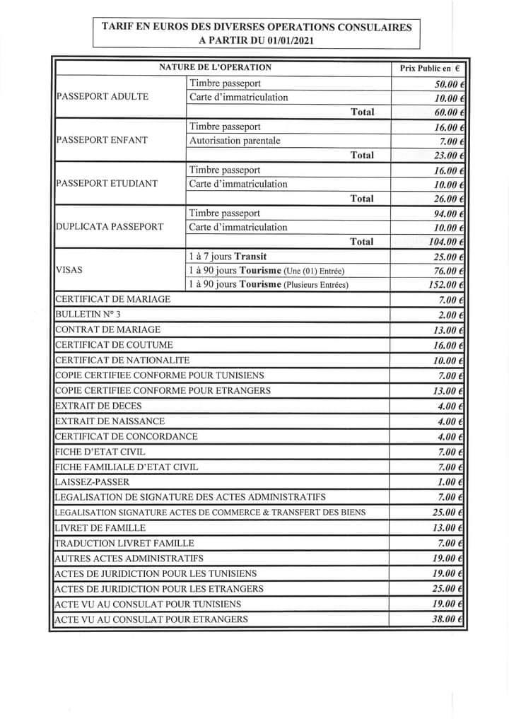 L’Ambassade de Tunisie à Paris et les différentes missions consulaires tunisiennes en France ont publié une liste détaillée reprenant notamment les nouveaux tarifs des différents services fournis aux Tunisiens.