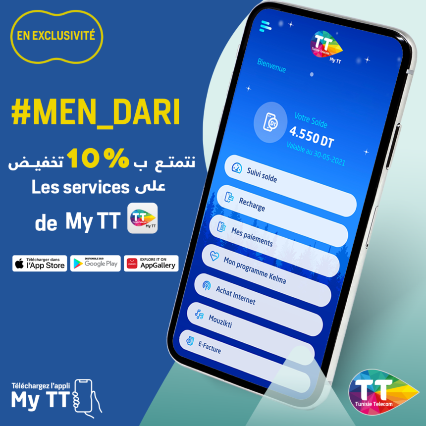 Dans le but subvenir aux besoins de ses clients durant les quatre jours de confinement obligatoire quasi-total décrété par les autorités tunisiennes pour endiguer la propagation du coronavirus; et afin d’assurer la continuité de ses services, Tunisie Telecom relance son initiative #Men_Dari. Ainsi, elle accorde une remise de 10% sur les transactions effectuées sur son application « My TT »; et via le site https://www.tunisietelecom.tn