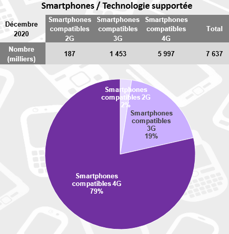En ce qui concerne la technologie supportée, il ressort de ce rapport que les terminaux compatibles 4G représentent 53% du total des appareils utilisés par les abonnés de tous les opérateurs. Les terminaux compatibles 3G ne représentent que 16%. Les smartphones compatibles à la technologie 4G sont au nombre de 5,9 millions.