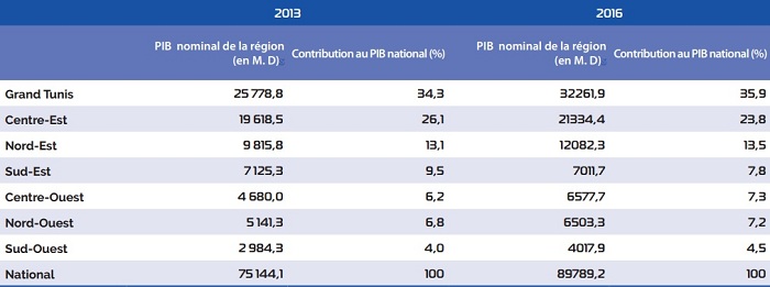 Trois régions sont les plus riches de Tunisie. Elles concentrent en 2016 près des trois quarts de la création de richesse : le Grand Tunis (35,9%), la région Centre-Est (23,8%) et la région Nord-Est (13,5%).