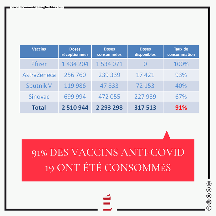Le tableau détaille le nombre et le taux des doses réceptionnées, consommées et disponibles. Ainsi que le taux de consommation de différents vaccins anti Covid disponibles en Tunisie: