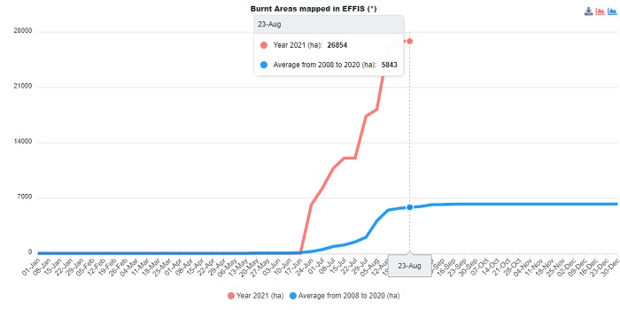 Selon EFFIS, cette superficie représente en moyenne 80% environ de la surface totale brûlée si l’on tient compte des feux de forêts inférieur à 30ha. En effet, cette superficie représente 4,64 fois la valeur moyenne des années 2008-2020 (5789 ha) à la même date.