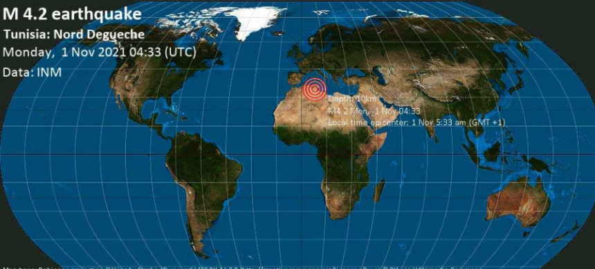 Selon les analyses préliminaires des services sismologiques relevant de l’Institut national de la météorologie (INM), un séisme de magnitude 4,2 s’est produit tôt le matin du lundi 1er novembre 2021 à 5h33 heure locale près de Tozeur.