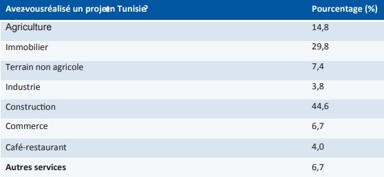 Les investissements réalisés par les migrants actuels tunisiens portent sur des domaines classiques, et souvent dans plusieurs à la fois. A savoir principalement: la construction (44,6% des répondants); l’immobilier (29,8%); l’agriculture (14,8%); ou le commerce au sens large pour plus de 17% d’entre eux.