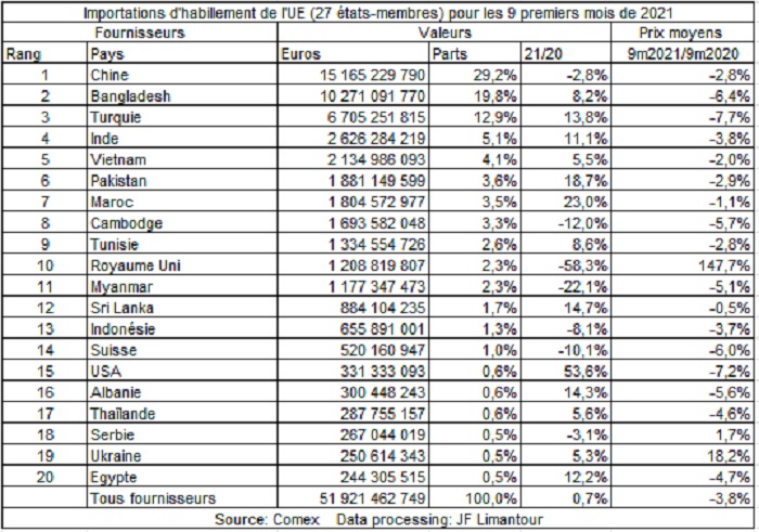 Les importations d’habillement de l’UE (51,9 milliards d’euros) n’ont progressé que de 0,7 % au cours des neuf premiers mois de 2021 par rapport à la même période de 2020, reflet de l’atonie de la consommation vestimentaire européenne tendanciellement en baisse relative dans le budget des ménages depuis plusieurs années et bien sûr plombée par l’épidémie persistante de Covid-19.