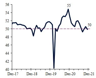 L’indice directeur des achats (PMI) de l’industrie manufacturière chinoise, un indicateur basé sur une enquête qui détermine si plusieurs composantes de l’activité se sont améliorées ou détériorées par rapport au mois précédent, a atteint un pic de 55 en novembre 2020, avant de glisser progressivement vers 50 en novembre 2021 (graphique 1).