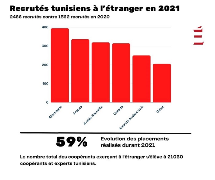 En effet, dans ce communiqué, l’ATCT affirme qu’elle a enregistré une évolution de 59% des placements réalisés durant 2021. Soit 2486 recrutés tunisiens contre 1562 recrutés en 2020.