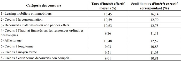 En effet, le tableau suivant comporte le taux d’intérêt effectif moyen relatif au deuxième semestre 2021 pour chaque catégorie de concours bancaire. Ainsi que le seuil du taux d’intérêt excessif correspondant, au titre du premier semestre 2022.