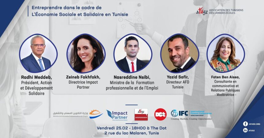 Pour tenter de répondre à ces questions, l’ATUGE a invité: Nasreddine Nsibi, ministre de la Formation professionnelle et de l’Emploi; Faten Ben Aissa, consultante en communication et Relations publiques; Radhi Meddeb, Président de l’association Action, Développement et Solidaire; Yazid Safir, Directeur de l’AFD; et Zaineb Fakhfakh, Directrice Impact Partner.