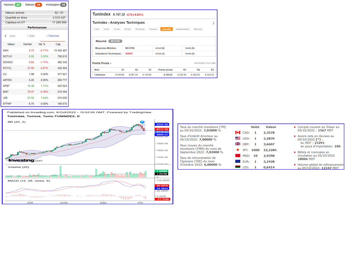 La Bvmt clôture la séance du jeudi 6 octobre 2022 dans le rouge. TUNINDEX : 8.167,32(-2,74pts) ; (-0,03%)