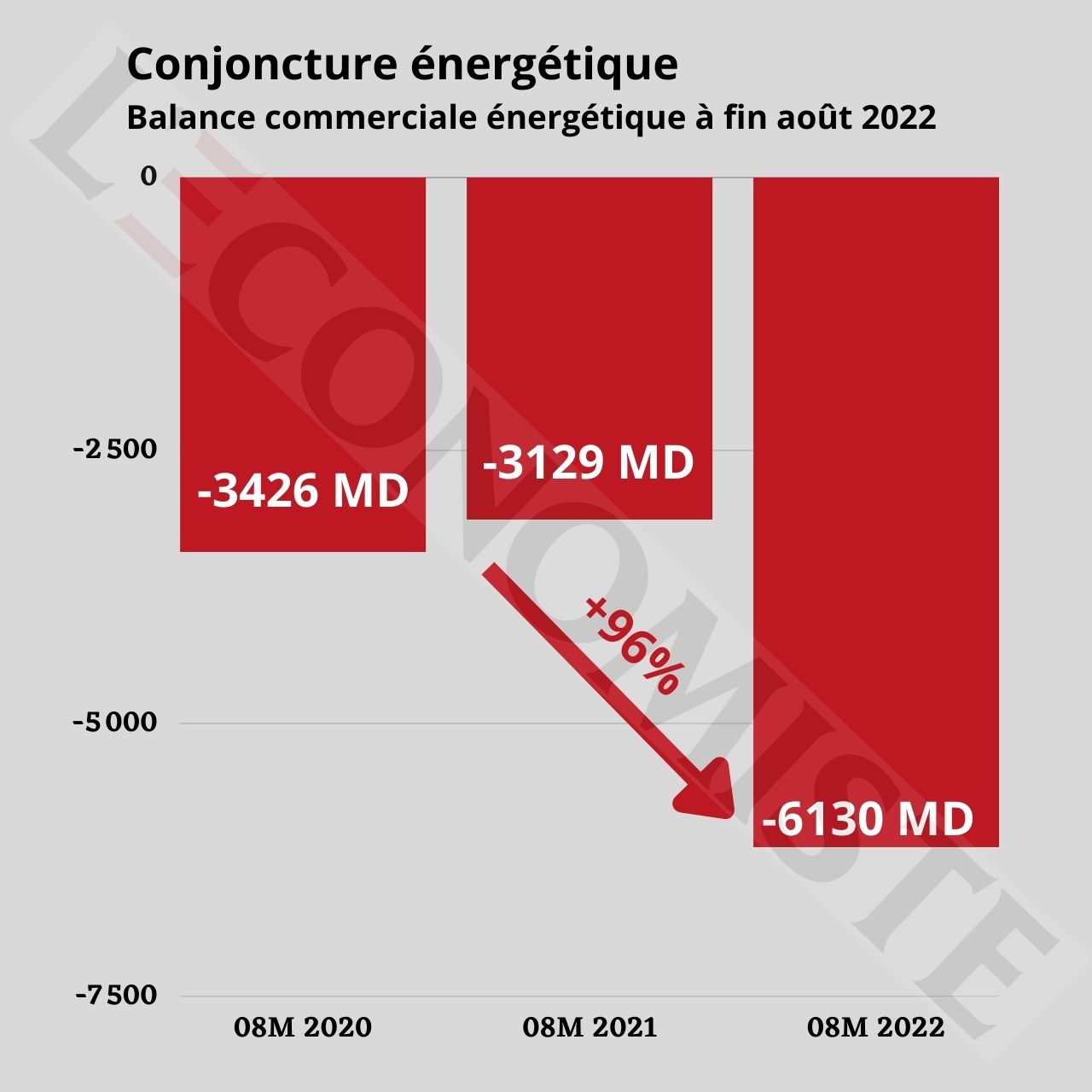 Le déficit de la balance commerciale énergétique est passé de 3129 MDT à fin août 2021 à 6130 MD à fin août 2022, soit une augmentation de 96%. Et ce, en tenant compte de la redevance du gaz algérien exportée.