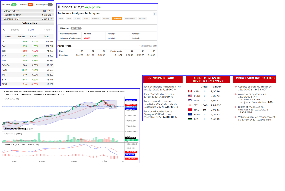 La BVMT clôture la semaine au vendredi 14 octobre 2022 dans le vert. Tunindex 8.125,17 (+16,04pts), +0,20%