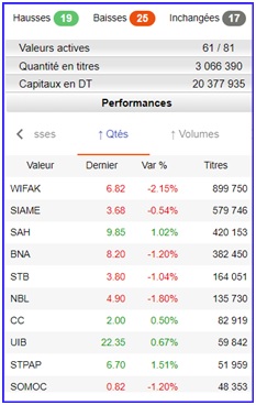 - Sur 61 valeurs actives 19 panneaux en hausse, contre 25 en baisse et 17 inchangées, pour un fort volume d’échange, de plus de 20.377 MDT.