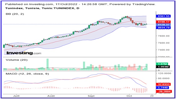 D’un point de vue graphique, on notera, comme nous l’avions suggéré la semaine dernière, que le TUNINDEX se positionne dans un canal d’attente (8100-8150), avec une propension à la consolidation baissière, au voisinage du seuil à 8130 points, comme le matérialisent le graphique en chandelier ci-dessus et le MACD qui lui est associé.