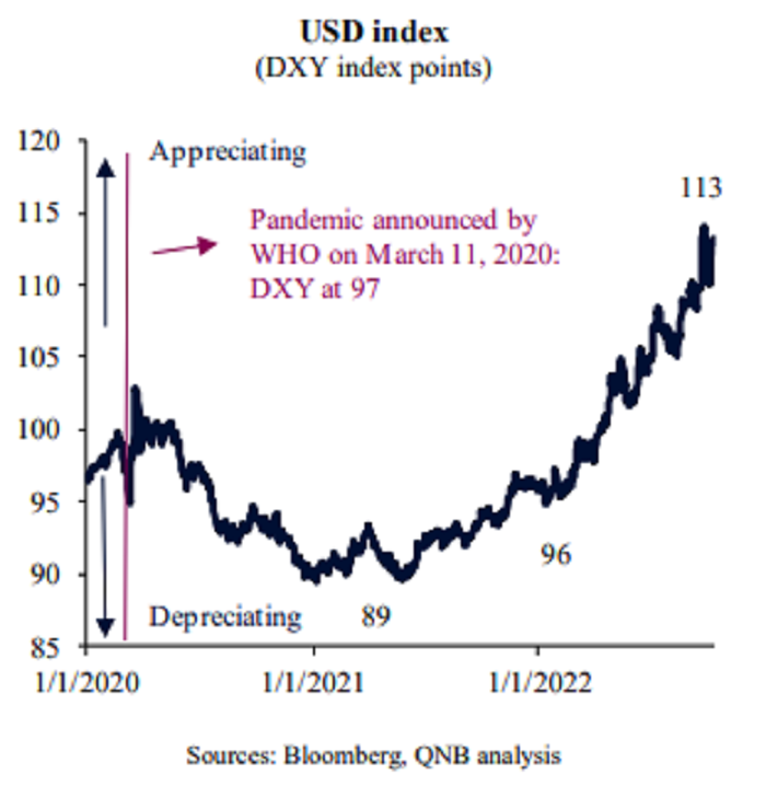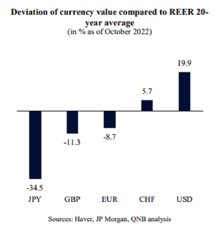Tertio, les taux d’intérêt réels escomptés, qui permettent d’ajuster le taux d’intérêt à moyen terme par des mesures d’inflation prospectives, devraient également évoluer dans une direction favorable au dollar. Cela est imputable non seulement à l’attitude agressive de la Réserve fédérale américaine (Fed), mais aussi au fait que l’inflation américaine a probablement culminé. En revanche, les prévisions d’inflation ont augmenté dans la zone euro et au Japon, où les banques centrales sont beaucoup plus circonspectes en termes d’agressivité dans la lutte contre l’inflation, en raison d’économies plus faibles et de niveaux d’endettement plus élevés. Les écarts de taux d’intérêt réels constituent l’un des principaux catalyseurs des flux de capitaux, les investisseurs cherchant à investir leurs ressources dans des actifs offrant des rendements réels élevés, ajustés au risque.