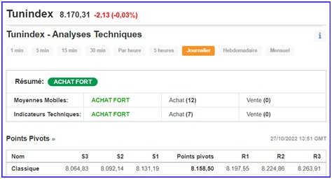 Pour un Point Pivot de 8167,21pts, le TUNINDEX se retrouve en au-delà de son point pivot, avec :