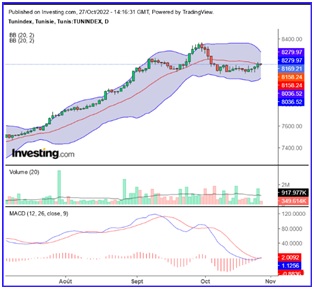Les analyses graphiques et techniques confirment le positionnement du Tunindex au milieu d’un canal haussier (8150-8200 pts) et au milieu des Bandes de Bollinger, avec une fiabilité moyenne sur fond de liquidités plus contraintes et avec plus de tensions sur les taux.
