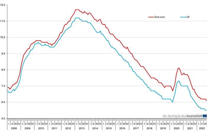 En septembre 2022, le taux de chômage corrigé des variations saisonnières de la zone euro était de 6,6%, en baisse par rapport au taux de 6,7% enregistré en août 2022 et aussi par rapport au taux de 7,3% enregistré en septembre 2021.