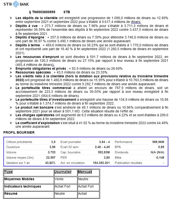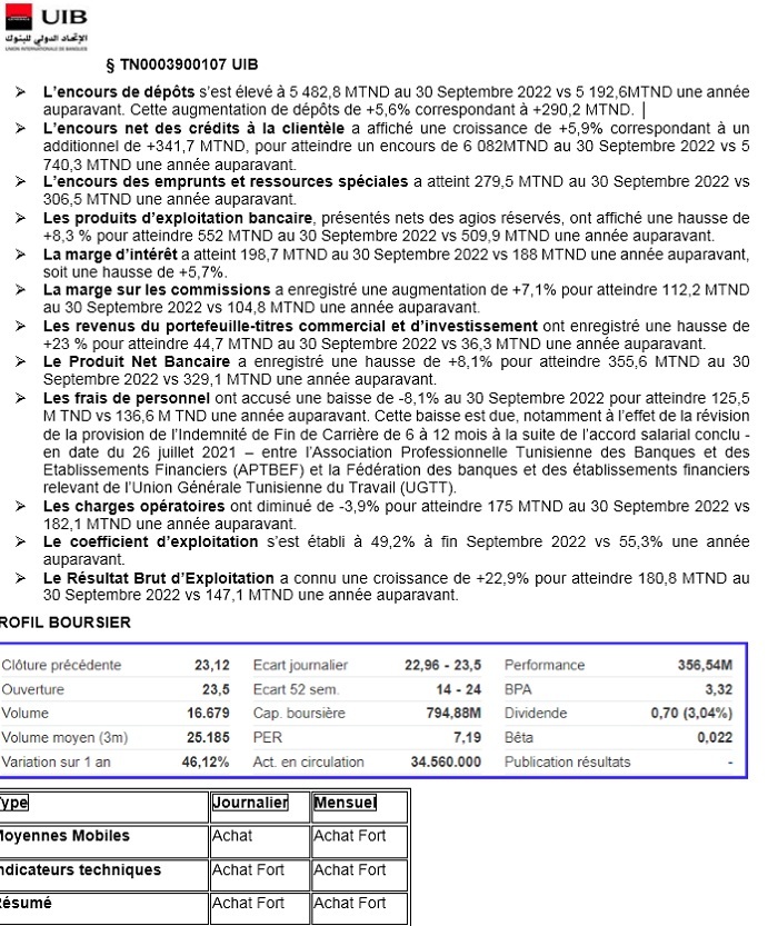 Les bénéfices et la rentabilité des banques tunisiennes ont explosé au-delà des niveaux de 2021. La hausse des taux d’intérêt soutient la rentabilité du secteur.Les fondamentaux du secteur bancaire: bénéfices et rentabilité en hausseSeulement 1% des dépôts des clients du secteur sont en devises étrangèresFondamentaux spécifiques et profils boursiers