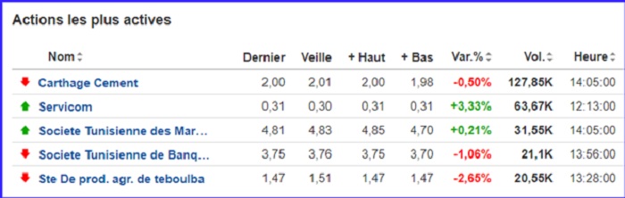 • Sur 57 valeurs actives, 17 sont à la hausse, contre 22 à la baisse et 18 inchangées.Actions les plus actives
