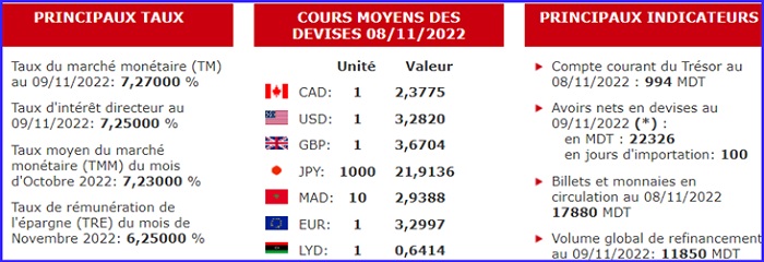 • Les billets et monnaies en circulation en légère baisse à : 17880 MDT, au (08-11);
