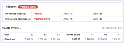 L’indice de la place se positionne à la marge des 8050(+) pts, avec une propension à la BAISSE (fiabilité forte).