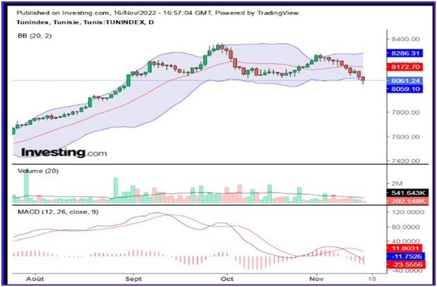 Devenu globalement vendeur depuis le 09 novembre, le marché des actions se repositionne au plus bas d’un canal transitoire à (8050–8100) pts, comme le montrent le graphique en chandeliers et ses indicateurs (BB, MACD) associés, ci-dessus.