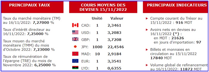 - Les billets et monnaies en circulation en légère baisse à : 17840MDT, au (15-11).