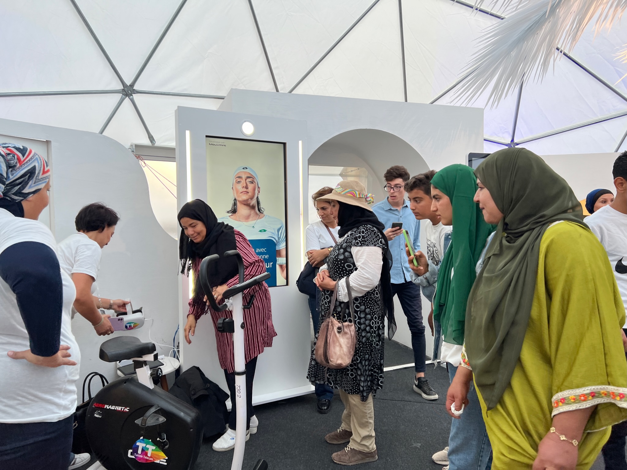De plus, Tunisie Telecom met la technologie au service du sport, de la culture et de l’innovation. Kaouther Khlifi présente les activités au pavillon Tunisie : « Un vélo d’appartement connecté à un casque de VR montre un film sur l’île de Djerba lorsque l’utilisateur pédale.