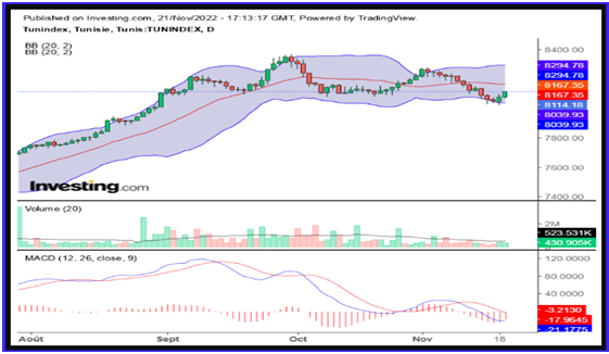 D’un point de vue graphique, on notera, comme nous l’avions déjà anticipé, que le TUNINDEX se positionne encore dans un canal BAISSIER (depuis le 02 nov. 2022), avec une tendance au tassement et/ou au rebond, vers le milieu des Bandes de Bollinger (BB 20-2), à 8170 points, comme le matérialisent le graphique en chandelier ci-dessus et le MACD qui lui est associé.