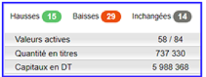 Sur 58 panneaux actifs, 15 sont en hausse, 29 sont en baisse et 14 inchangés, pour près 6.0 MDT de transactions.