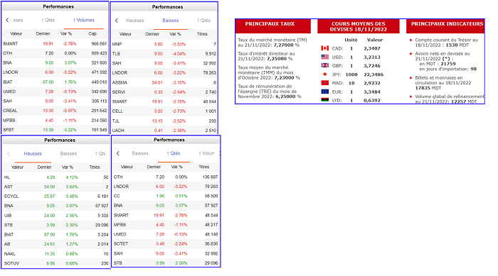 Taux du marché monétaire (TM) au 21-11-2022 : 7,27% ; Taux d’intérêt directeur au 21-11-2022 : 7,25 % ; Taux moyen du marché monétaire (TMM) du mois d’octobre 2022 : 7,23000 %.