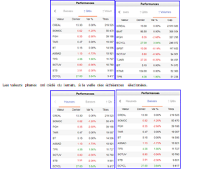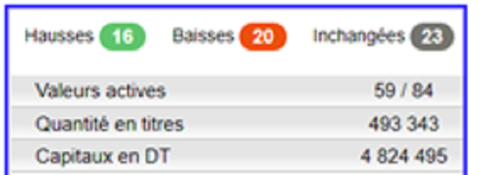 - Sur 59 valeurs actives, 16 sont à la hausse, contre 20 à la baisse et 23 inchangées.