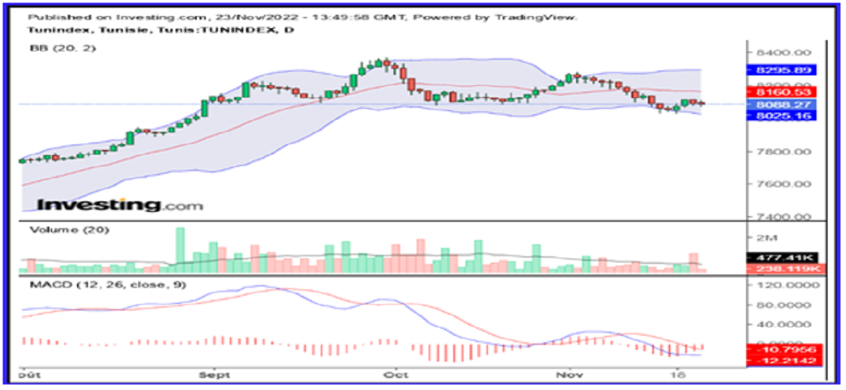 Devenu globalement vendeur depuis le 09 novembre (MACD en territoire négatif, notamment), la BVMT s’installe en haut d’un canal transitoire à (8050–8100) pts, comme le montrent le graphique en chandeliers et ses indicateurs (BB, MACD) associés, ci-dessus.