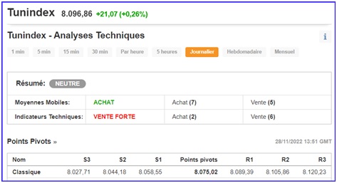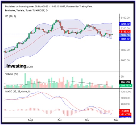D’un point de vue graphique, on retiendra que le TUNINDEX se positionne encore dans un canal baissier (depuis le 02 nov. 2022), mais avec une tendance à la reprise ou du moins, au rebond vers le milieu des Bandes de Bollinger (BB 20-2), à 8140 points, comme le matérialisent le graphique en chandelier ci-dessus et le MACD qui lui e