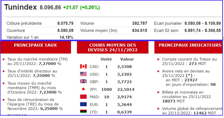 - Taux du marché monétaire (TM) au 25-11-2022 : 7,27% ; Taux d’intérêt directeur au 25-11-2022 : 7,25 % ; Taux moyen du marché monétaire (TMM) du mois d’octobre 2022 : 7,23000 %.