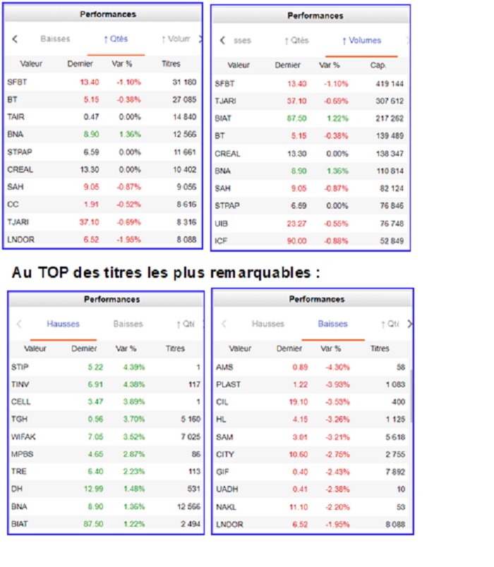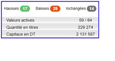 Sur 59 valeurs actives, 17 sont en hausse, contre 28 en baisse et 14 inchangées, pour près de 229K. titres et près de 2.132 MDT de transactions.